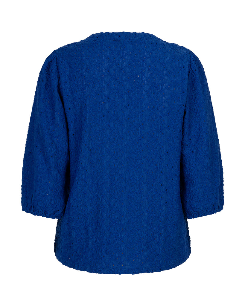 DETAILS  De Top Ajour is gemaakt van broderie en heeft een V-hals. De top heeft driekwart ballon mouwen met elastiek aan het uiteinde van de mouw.
