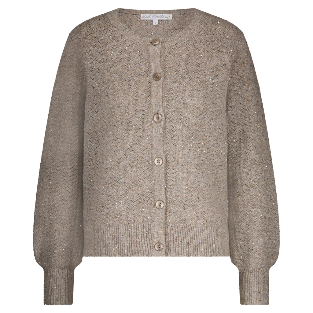 De Cardigan Ajour Sparkle is een ajour gebreid vest met een ronde hals en een knoopsluiting aan de voorkant. Er zit een glitter door het breisel en het vest heeft geribde boorden.
