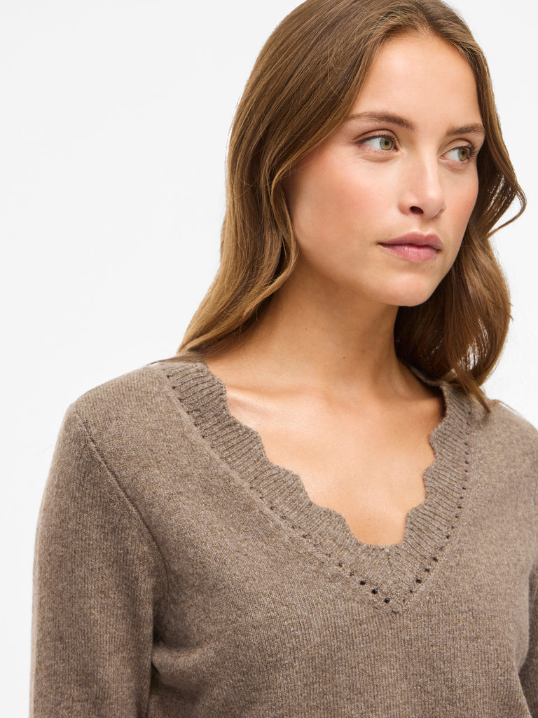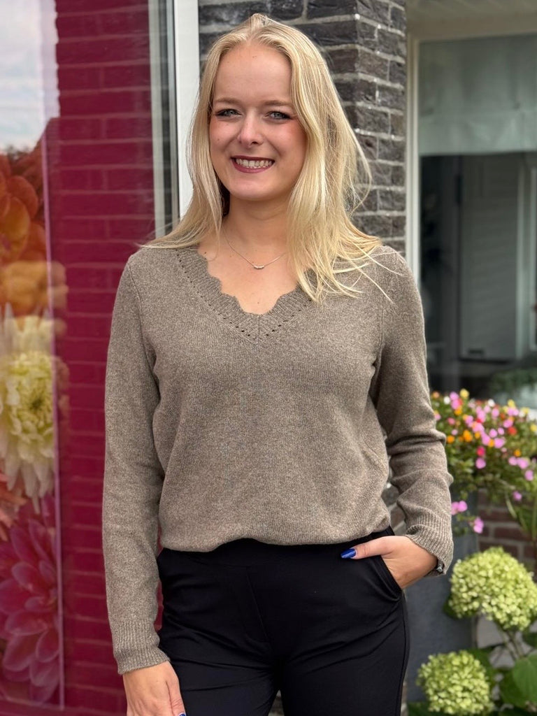 DETAILS Deze trui van Vila is een echte allrounder: zacht, warm en toch luchtig genoeg om het hele seizoen door te dragen. De subtiele scallop-rand langs de V-hals geeft ‘m een vrouwelijke twist. Met de relaxte pasvorm en lange mouwen zit ‘ie heerlijk comfortabel. Draag ‘m casual op jeans of chic met een rok – deze trui kan alles aan.