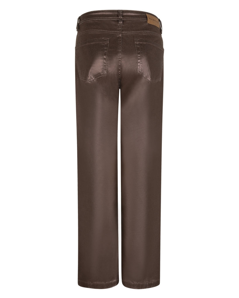 De Colette Sparkle is een wide leg broek met een glanzende coating. De broek is aansluitend op de heup en loopt vanaf de bovenbeen wijd uit. De Colette Sparkle heeft een comfortabele hoge taille en 5 zakken. De broek is gemaakt van een stretch kwaliteit voor ultiem comfort.